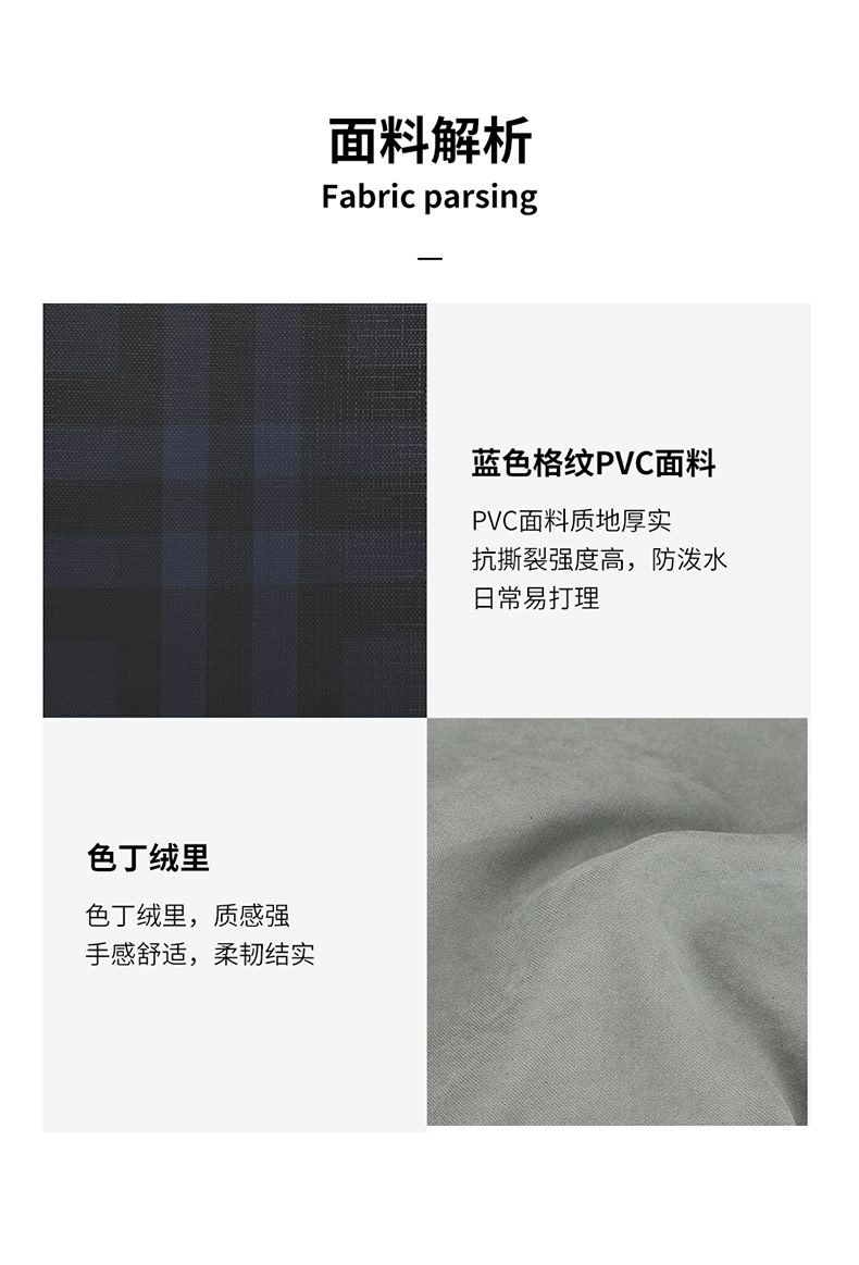PVC面料质地厚实,抗撕裂强度高,防泼水,日常易打理;