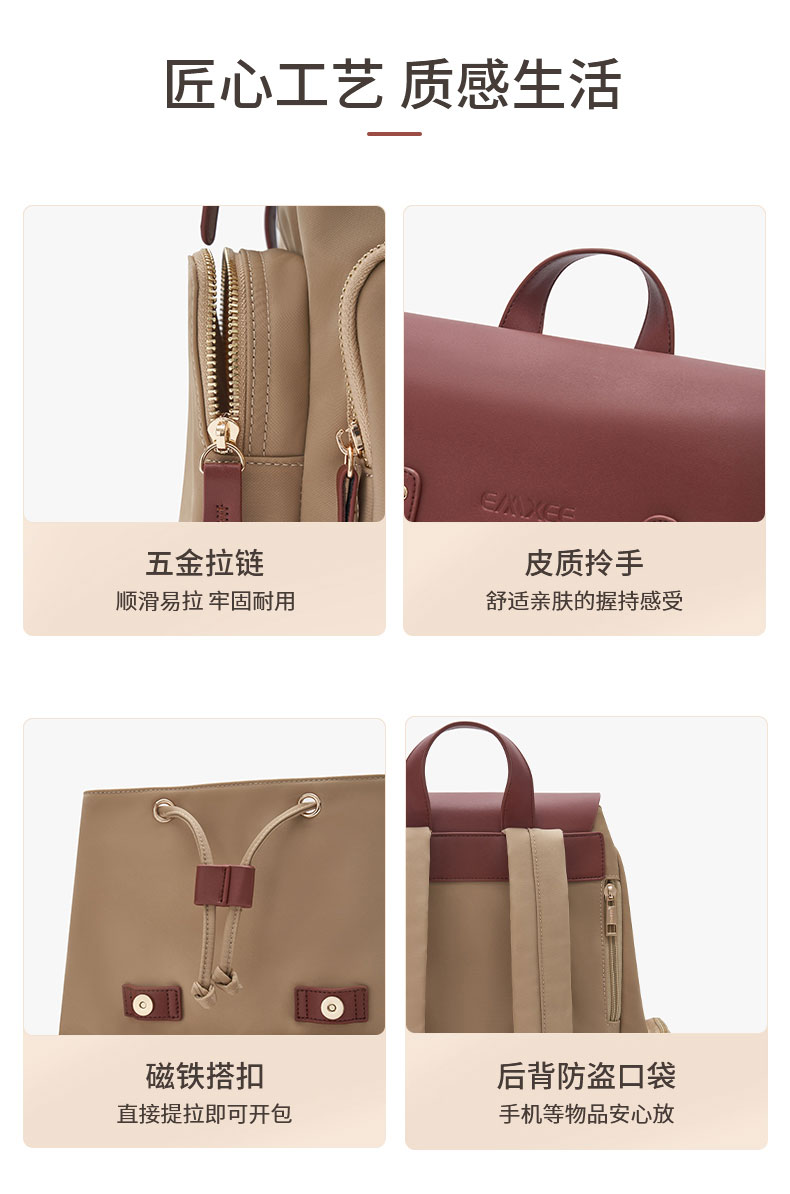五金拉链顺滑易拉,牢固耐用,皮质拎手,后背防盗口袋;