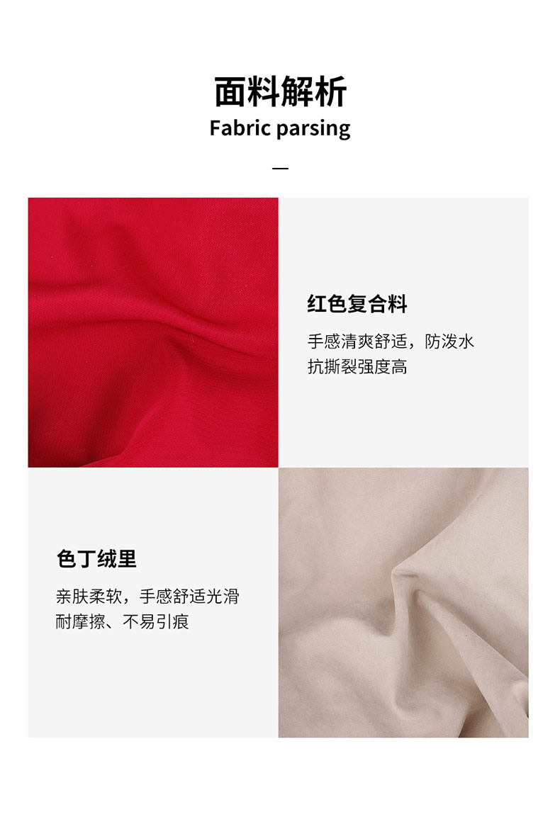 红色复合料,手感清爽舒适,防泼水,抗撕裂强度高;