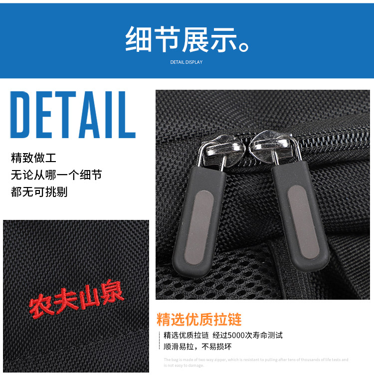 农夫山泉礼品包定制精选高密度优质面料,手感细腻,清晰纹路。精选优质拉链,经过5000次寿命测试,顺滑易拉,不易顺坏。结实手挽,手感舒适不嘞手。主要特点是方便携带,解放双手,轻负重、耐磨佳,为外出提供了方便。广东豪门国际科技创办于1997年,致力于背包、双肩包设计生产销售的箱包生产厂家,自有厂房1.5万平米,引进日本JUKI和BROTHER等高端品牌机器设备。豪门国际 提供颜色,材料都可以选择,如果没有您喜欢的款式,可以免费设计。大部分是样品,非现货,少量现货,请咨询客服,接受来样来图定制!定制热线:185-7539-1373