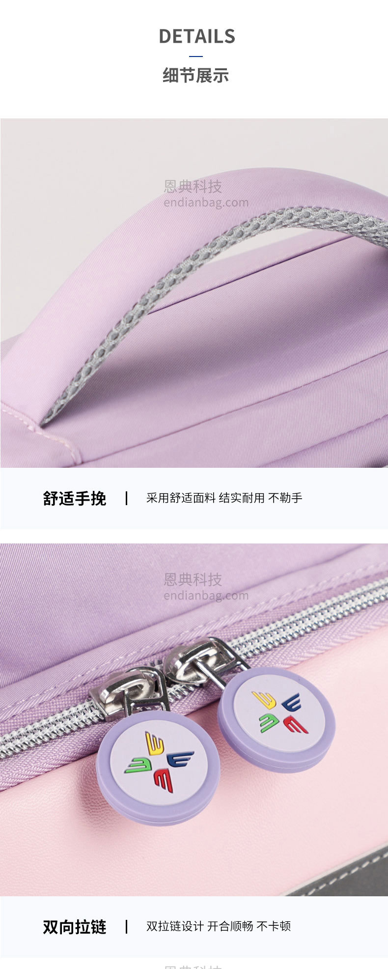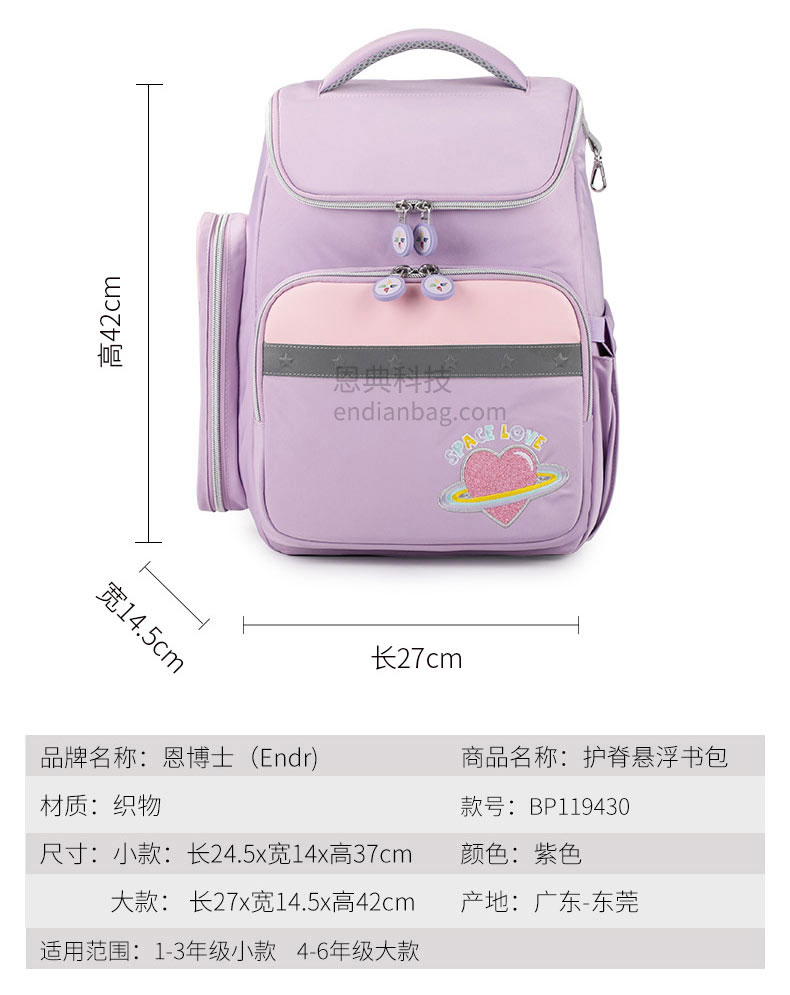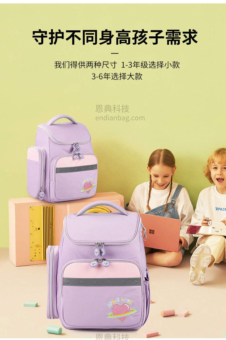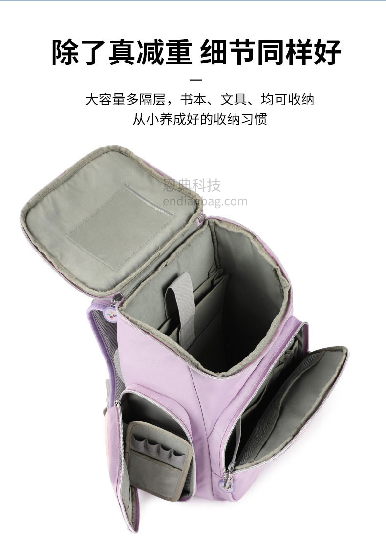 减负护脊悬浮学生书包定制采用防泼水舒适面料,防泼溅、防勾蹭。动态弹性结构设计,降低孩子背负重量。大容量多隔层,书本、文具均可收纳。舒适手挽,结实耐用不勒手,双拉链设计,开合顺畅,不卡顿。学生书包定制请认准广东豪门国际科技,25年箱包行业生产定制经验,自建1.5万平米工业园,8000平米工作区,462名艺师,16条生产线,日产量可达13000Pcs。自有实验室拥有恒温恒湿、拉力、盐雾、破裂、拉链往复等检测设备,从原材料到成品每一个环节都经严格的检测,豪门国际皮具所使用的材料均达到国际环保REACH标准,客户中标率和返单率高达70%,5年畅销达到500万个。从开发到生产,专人为您把关每一个环节做好跟进服务。定制热线:18575391373