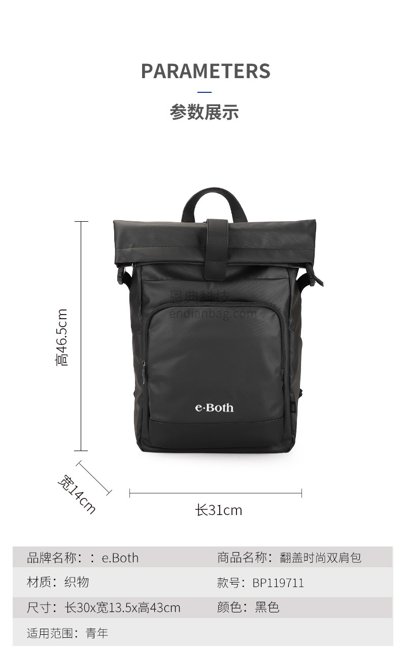男士翻盖时尚双肩包,精选优质面料,遇水不易渗透,耐勾蹭;