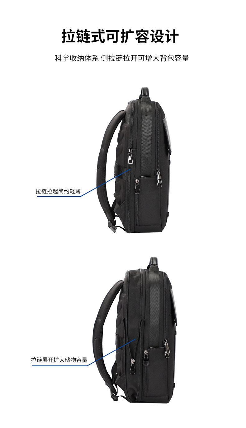 科学收纳体系,侧拉链拉开可增大背包容量;