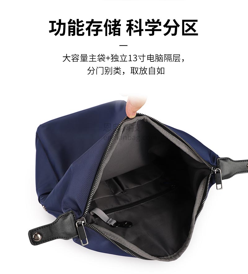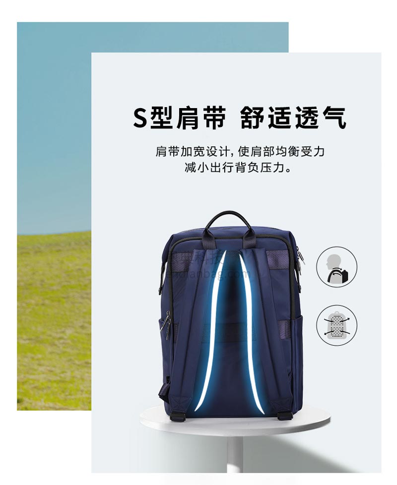S型肩带,肩带加宽设计,肩部均匀受力,大容量主袋+13寸电脑隔层;