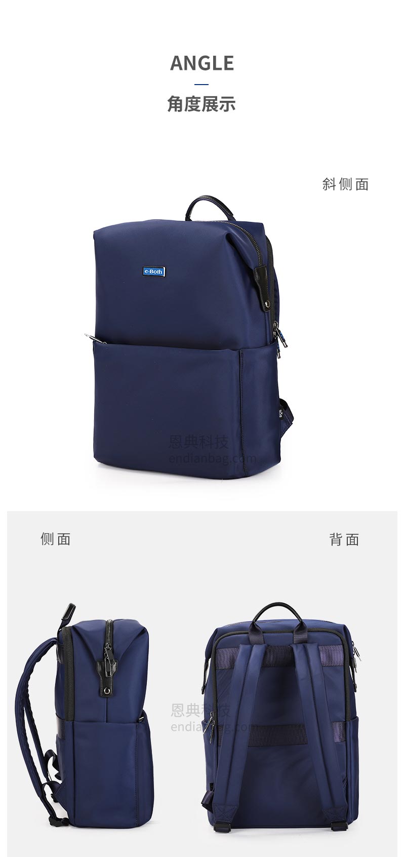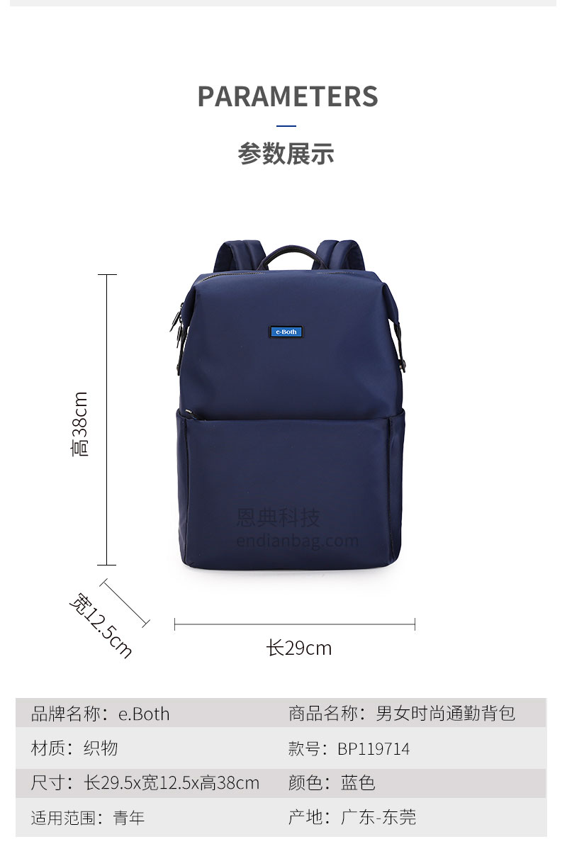 男女时尚通勤双肩包,采用高密织织物,4级防泼水;